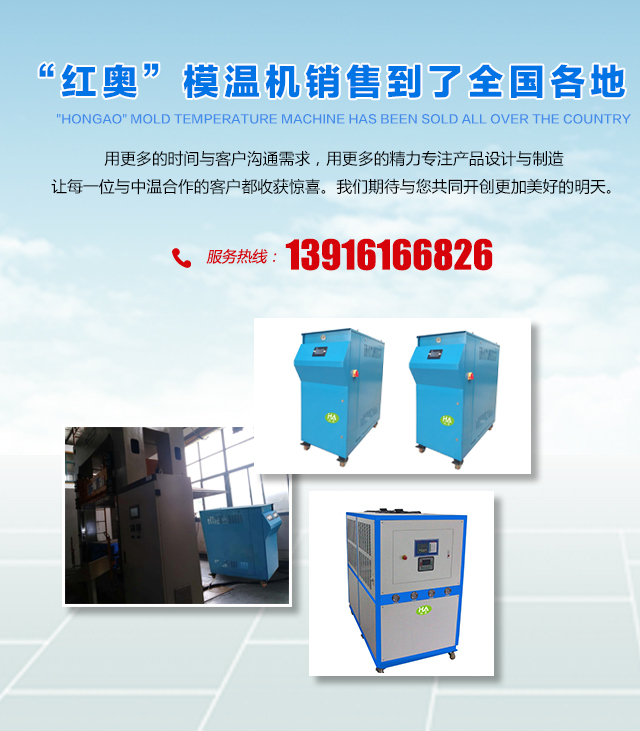 公司旗下擁有紅奧品牌模溫機,公司設立有研發部,銷售部,制造部,售后服務部,公司主要產品由:油溫機、水溫機,非標定制模溫機,冷水機,冰水機、點冷機、冷熱一體機,導熱油加熱器、電加熱導熱油爐及溫度控制系統的定制和改造升級。產品涵蓋了壓鑄,注塑,吹塑,擠出生產線,高分子成型,工業干燥,薄膜加工,金屬板制造,印刷,食品,醫療,反應釜等行業。十多年來,在全體同仁的不懈努力下,“紅奧”模溫機銷售到了全國各地,得到了廣大客戶和社會各界的認可與支持...